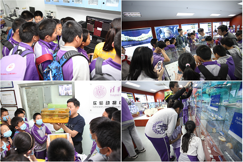 同学们首先来到清华大学标本馆,在志愿者的引导讲解下欣赏了“四大名螺”等珍稀标本及千余种精品贝壳和部分植物标本。随后参观了膜生物学国家重点实验室清华分室,并且利用激光共聚焦显微镜观察了人和动物的多种细胞形态及运动轨迹。在清华大学实验动物中心,研究人员向大家介绍了为何选择小鼠做实验以及其目的意义;随后小伙伴们带上口罩和鞋套参观了实验小白鼠的生活环境,观摩了实验小鼠的行为表现等。
