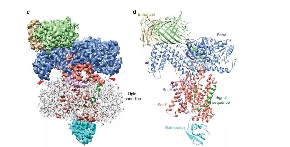 蛋白转运是生物生命活动中一种必不可少的过程,可以将分泌型蛋白从细胞内输出并将膜蛋白整合到脂质双分子层中。转运的核心组分是进化上保守的蛋白转运通道,在真核生物中为Sec61通道,在原核生物中为SecY通道。Sec61 / SecY通道可以使多种蛋白在真核生物内质网膜或原核生物的质膜上进行转运。在细菌中,大多数分泌型蛋白通过SecA ATPase的介导,穿过SecY通道实现翻译后转运。但是由于缺乏结构信息,人们对多肽如何通过SecA- SecY复合物的理解知之甚少。此文章解析了脂质环境下SecA-SecY复合物中间态的电子冷冻显微镜(cryo-EM)结构,首次揭示了多肽底物与SecA-SecY在转运过程中的相互作用。