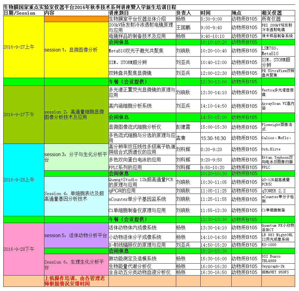 膜生物学国家重点实验室仪器平台新学年技术培训定于2016年9月27日至28日在中科院动物所B105报告厅举行,本次活动将对膜室仪器平台仪器进行全面介绍,并对重要仪器和新仪器进行专门介绍(详见日程安排),欢迎动物所及兄弟单位师生参加。本次论坛将免费提供茶点和午餐,请参会者将报名回执于9月23日前反馈给杨铁老师(yangt@ioz.ac.cn,64807319)。
