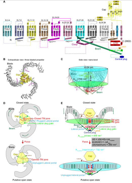 (B)Piezo2三叶螺旋桨结构的胞外俯视图。每个亚基包含38次跨膜螺,三聚体共计114次跨膜螺旋区的方式组装成含跨膜螺旋区最多的大型膜蛋白复合体。