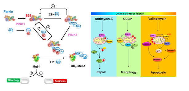 图1:PINK1激活Parkin并调控细胞命运的机制