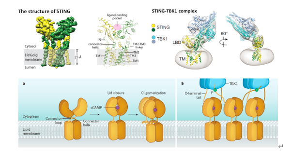 图2:STING蛋白的结构基础和STING-TBK1通路的激活机制
