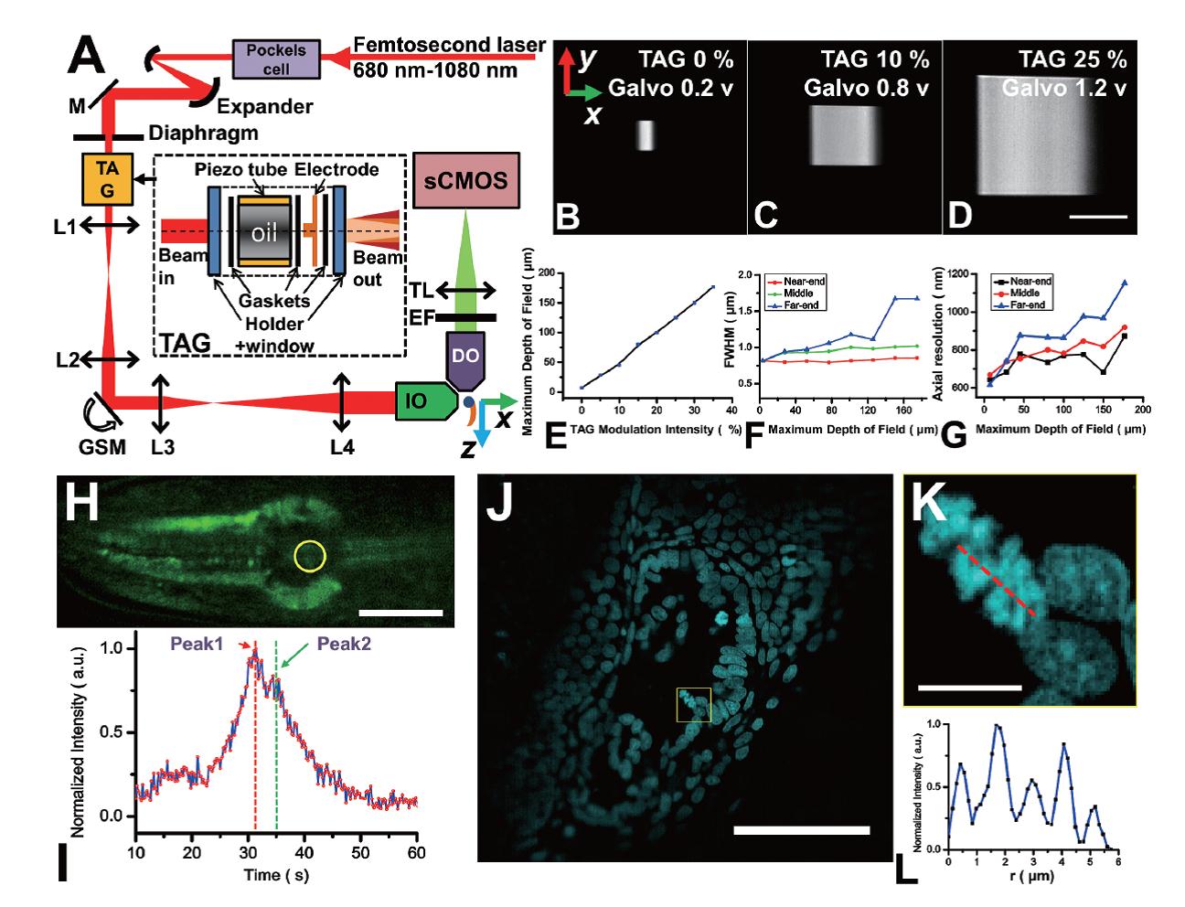为实现仪器研发与前沿科学问题的珠联璧合,论文中已将新成像系统成功用于斑马鱼心脏发育、心肌细胞钙火花、秀丽线虫超氧炫研究。项目组程和平院士、周专教授、陈良怡教授和孙育杰研究员等全程参与了该项研究。