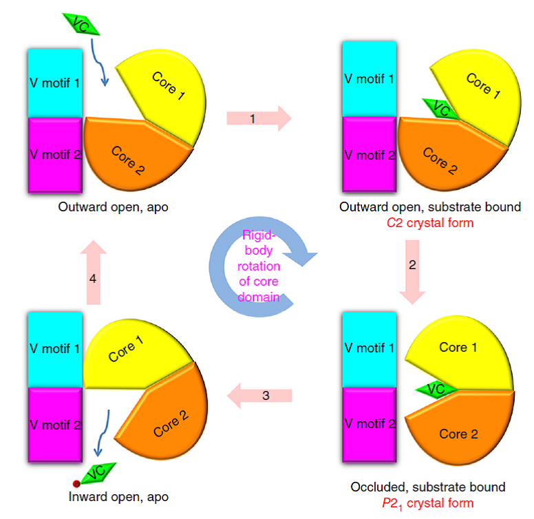 王佳伟研究组选择大肠杆菌中的UlaA蛋白作为研究对象,通过X-射线晶体衍射的方法解析出了两组不同构象的UlaA高分辨率晶体结构,衍射分别是1.65 Å和2.35 Å。在这两个已获得的结构中,UlaA都结合有底物维生素C,并以二聚体形式行使功能。解析的UlaA结构呈现出一个全新的复杂折叠方式,每个UlaA分子包含有11个跨膜结构、4个凹角类发卡结构和3个水平方向两性螺旋,分子内都包含两个反向的对称单位,一根赝对称轴平行于膜表面。每个UlaA分子可以被分成两个部分,分别被称为V motif区域和core区域,二聚化的区域主要位于蛋白的V motif区域,而底物主要由core区域的氨基酸识别与结合。比较已获得的两个结构,两个不同的二聚体一共呈现出两种不同的构象,一种构象是结合底物后保持向外开放,另一种则是结合底物后两端封闭,这两种构象代表了UlaA转运底物的两个过程,根据这两个结构我们可以推断当UlaA结合底物后先是保持向外开口,进而core区域做刚体翻转封闭两端,最后经过一系列后续过程释放底物。这个结构比对初步揭示出UlaA蛋白在维生素C转运循环中的构象变化,为理解细菌中维生素C的转运与代谢过程提供了重要的分子基础。