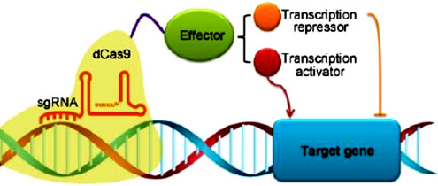 CRISPR interference或CRISPR-on是利用去核酸酶活性Cas9 (dCas9)与转录效应子(transcription effector)融合蛋白和多个特异引导RNA(gRNA)--dCas9融合系统,阻碍或激活靶基因转录的技术(图)。刘东课题组于3月27日在线(Cell Research)发表题为“Regulation of transcriptionally active genes via the catalytically inactive Cas9 in C. elegans and D. rerio”研究论文,首次将dCas9融合系统用于多细胞生物(斑马鱼和线虫),实现对靶基因表达的原位调控。