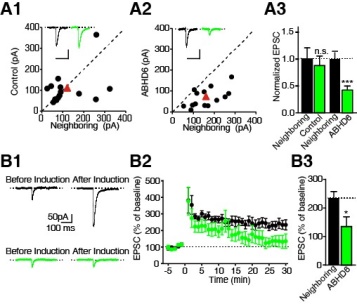 在神经元中,ABHD6的过表达可以显著性的降低AMPA受体介导的兴奋性的突触传递,但是对于NMDA受体介导的兴奋性突触传递并没有影响。在急性脑切片中,过表达或者敲低ABHD6得到相同的结果,并对于突触可塑性也有影响。进一步的研究表明,ABHD6对AMPA受体功能的抑制作用不依赖于它的水解酶活性。该研究揭示了ABHD6对调节突触部位的AMPA受体的转运和定位有重要作用。