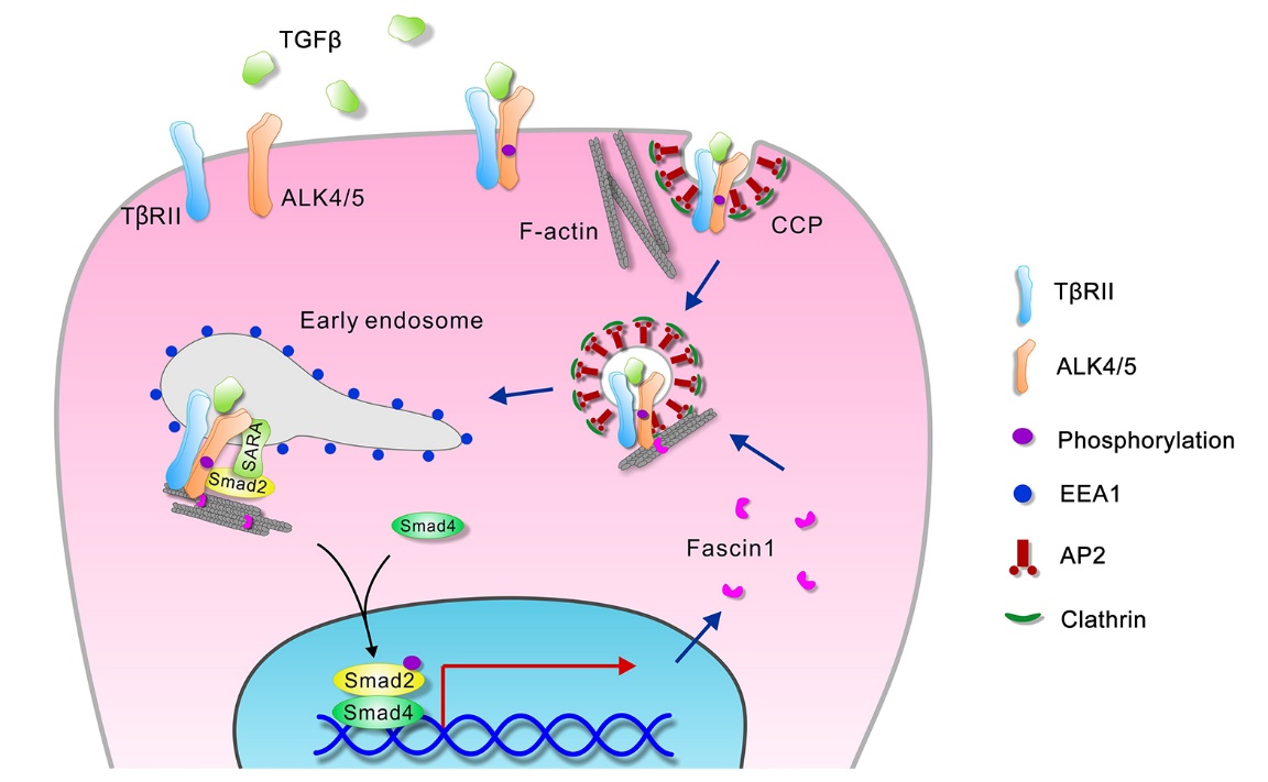 肌动蛋白(Actin)结合蛋白Fascin1(Fscn1)是另外一个Nodal/Smad2靶基因,在目前所知的大多数肿瘤中高表达,参与了肿瘤细胞伪足及突触的形成,与肿瘤患者的预后不良、生存期短及转移性强密切相关。细胞骨架包括微管蛋白(Tubulin)、肌动蛋白Actin和中间丝蛋白(intermediate filament)。已有研究表明微管系统参与了TGF-β信号通路的调控,然而肌动蛋白Actin有无调控功能还不清楚。在前期工作的基础上,王强研究组综合运用多种实验手段,发现在斑马鱼胚胎内胚层形成过程中,Fscn1特异表达在原肠期的中内胚层前体细胞中,并且其表达受到TGF-β/Nodal信号通路的直接调控。在斑马鱼胚胎及哺乳动物细胞中,Fscn1及其F-actin结合活性对于激活Nodal/Smad2信号通路和内胚层的形成至关重要。Fscn1作为TGF-β/Nodal I型受体和F-actin的连接分子,可以促进内吞的受体从clathrin内吞泡转运至早期溶酶体,从而促进TGF-β信号转导。鉴于Fscn1和TGF-β信号在肿瘤形成和发展中的重要作用,Fscn1和TGF-β/Nodal信号之间的这种正反馈调控机制对于肿瘤医学方面也具有重要的启示。