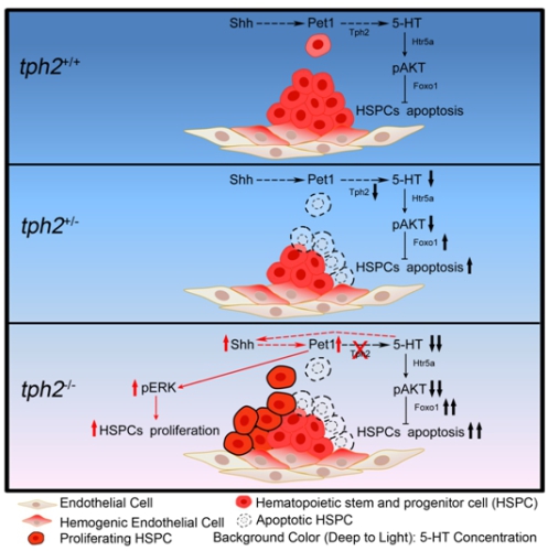 上述工作首次证实了5-HT在胚胎期HSPCs发育和扩增中的直接作用。该研究不仅拓展和完善了体内HSPCs发育过程的调控机制,同时也为体外诱导和扩增有功能的HSPCs提供了新思路。该研究论文“5-hydroxytryptamine synthesized in the aorta-gonad-mesonephros regulates hematopoietic stem and progenitor cell survival”于 2016年12月28日在线发表于Journal Experimental Medicine(DOI: 10.1084/jem.20150906)。