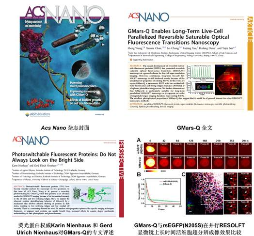 2014年美国哈佛大学庄小威课题组研制新型光转化荧光蛋白mMaple3,成功地用于基于单分子定位技术(PALM)的超高分辨成像。孙育杰课题组对mMaple3荧光蛋白的生色团和生色团相邻的氨基酸位点做饱和突变并经过定向筛选得到新型可逆光激活绿色荧光蛋白GMars-Q。这种新型可逆光激活荧光蛋白可以非常好地用于基于可逆饱和线性荧光跃迁原理(RESOLFT)的超高分辨率显微成像上。诺贝尔奖获得者Stefan Hell研究组在2013年发明的并行RESOLFT显微镜利用可逆光激活荧光蛋白rsEGFP及其变体为标记探针,可以实现大视野下的快速超分辨活细胞成像。但可惜的是现有的可逆光激活荧光蛋白的光物理性质并不能很好地满足并行RESOLFT显微镜来进行长时间活细胞成像。GMars-Q呈现出其它荧光蛋白少有的双态漂白模式,其有效的活细胞超分辨成像时间是rsEGFP(N205S)的10倍。同时GMars-Q在活细胞中具有更高的亮暗态荧光对比度。同时实验表明,GMars-Q单体性质较好,成熟较快,热稳定性较好,非常适合用于活细胞标记,在并行RESOLFT显微镜上可实现大视野下的超高时空分辨率长时间活细胞成像。GMars-Q较好的光学性质也同样预示着其在其他基于RESOLFT原理的超分辨活细胞显微术上也有广阔的应用空间。