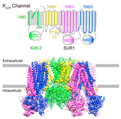 KATP是一个异源八聚体膜蛋白,分子量在880kDa左右。通过冷冻电镜的方法,陈雷研究组和高宁研究组联合解析了KATP蛋白在别构抑制剂药物格列本脲结合状态下的结构,分辨率为5.6?。该结构清晰的显示了KATP的组装模式,提出了KATP被抗糖尿病药物格列本脲别构抑制以及被PIP2别构激活的可能机制。