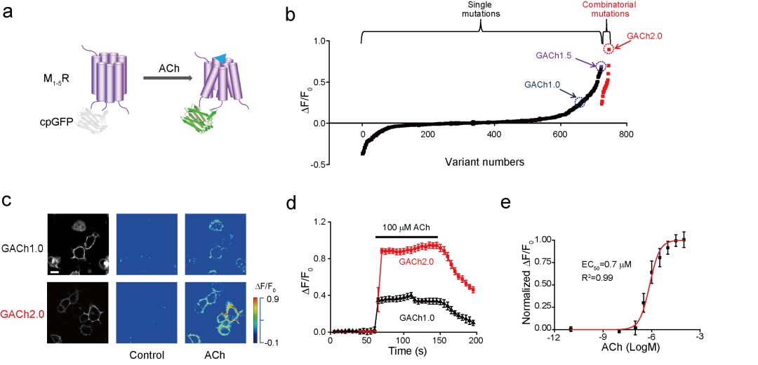 与其从头设计,不如借鉴大自然的鬼斧神工。该研究首次通过对于神经递质特异的G蛋白偶联受体(GPCR)进行改造,通过在特定位置嵌入循环重排的荧光蛋白,将受体在被神经递质激活后的构象变化转变为荧光蛋白荧光信号的变化,进而反映对应神经递质的浓度变化。通过对于乙酰胆碱受体的改造以及一系列突变筛选和优化,该研究获得对于乙酰胆碱具有灵敏光学响应的荧光探针,其对于生理浓度乙酰胆碱具有高信噪比的光学信号变化,并且具有亚秒级的反应速度以及良好的分子特异性,可实现时空特异的对于乙酰胆碱信号的精确指征。