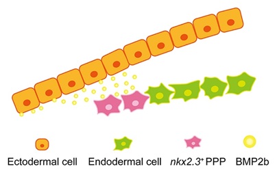 咽区外胚层表达分泌BMP2b,促进邻近内胚层细胞特化为咽囊前体细胞。