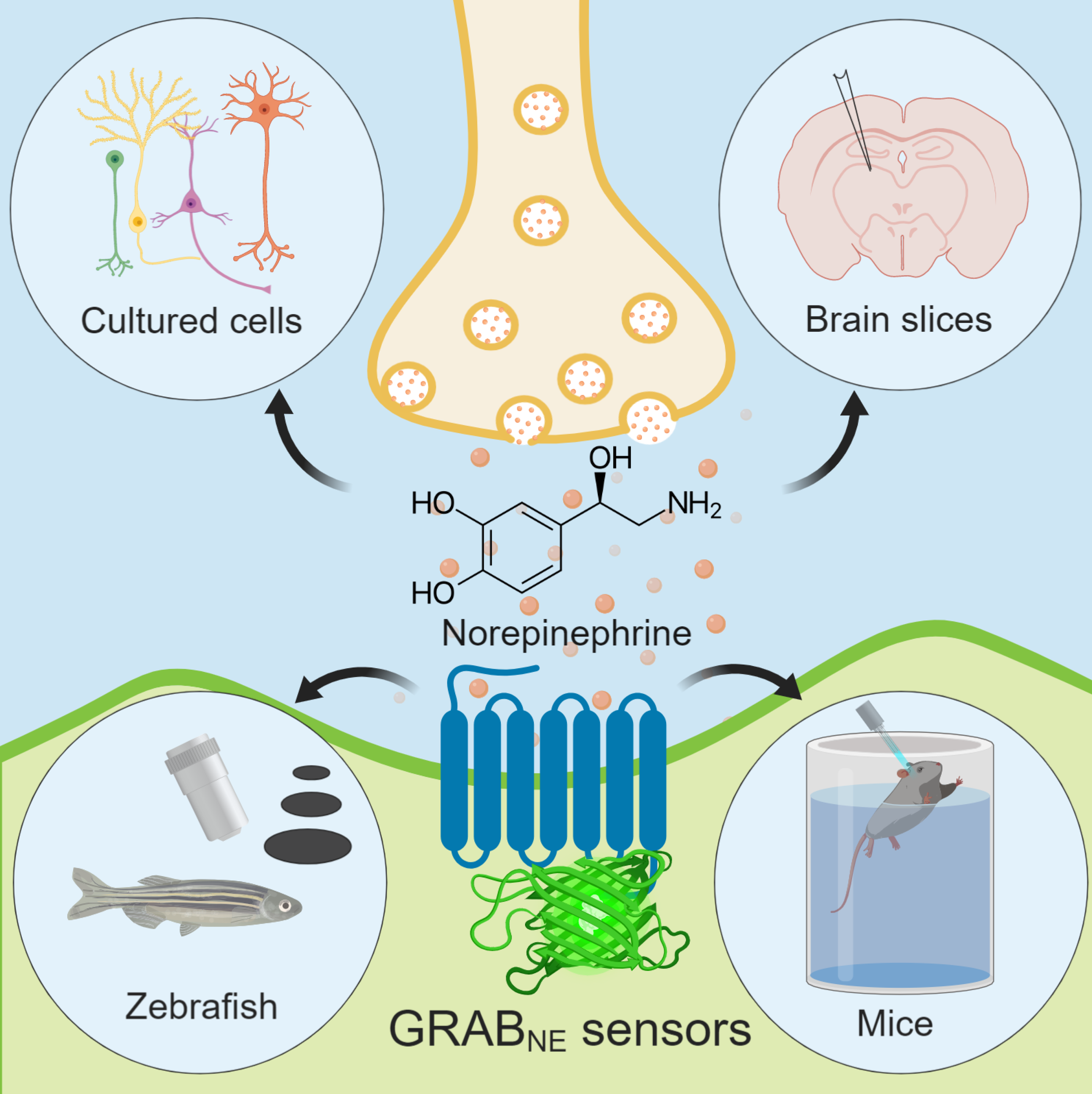 为了解决以上的技术瓶颈,李毓龙研究组开发并优化了一类基于G蛋白偶联受体激活(GPCR Activation Based)的去甲肾上腺素荧光探针(GRABNE)。通过在人源去甲肾上腺素受体特定位置嵌入对结构变化敏感的荧光蛋白(cpEGFP),使去甲肾上腺素这一化学信号转化为荧光信号,结合现有的成像技术,即可实时监测去甲肾上腺素浓度的动态变化情况。通过对探针全方位的优化,开发出具有低/高亲和力的两种版本的荧光探针(分别命名为NE1m和NE1h),除均具有极高的分子特异性和时空分辨率外,还可分别用于检测局部突触传递(synaptic transmission)和非局部非突触传递(volume transmission)的去甲肾上腺素释放。