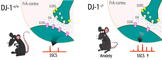 帕金森氏病(Parkinson,s disease, PD)是一种慢性进行性神经退行性疾病,病理特征是中脑黑质区域多巴胺能神经元的选择性死亡,其临床症状可以为两类:运动障碍和非运动性的症状。虽然运动障碍的症状出现在老年时期,但一些非运动性症状(包括情绪障碍)会发生在早期阶段,这些非运动类症状被认为是决定PD患者生活质量的主要因素。虽然情绪障碍对PD 患者的影响非常大,但是PD中情绪症状与多巴胺系统之间的关系在PD 患者和PD 动物模型中研究的还非常少。本研究利用清醒小鼠双光子成像技术、在体电化学技术、脑片电化学技术、高效液相色谱技术以及行为学检测技术在PARK7/DJ-1 敲除小鼠中发现:PARK7/DJ-1 敲除小鼠中前额叶皮层的神经元活动显著增强;这种增强是由突触后的D2 受体表达量减少(而不是多巴胺释放)引起的,而且与动物本身的焦虑行为相关。