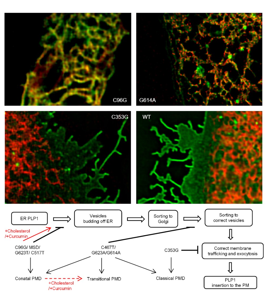 研究团队在佩梅病患者群中选取了7种病人来源的不同临床分型的PLP1错义突变,利用海森结构光超分辨成像手段,观察比较正常和疾病细胞内PLP1蛋白运输与分泌过程的差异。研究发现,PLP1的突变会引起三种细胞表型,与病人的临床分型完美对应。进一步,超分辨率成像也揭示了亚型间不同的发病机制:最严重表型细胞中PLP1驻留在内质网中,引起内质网的形变;中间型细胞中很大一部分PLP1转运出内质网和高尔基体,但是被错误分选到溶酶体中;轻微表型的细胞中PLP1被正确的分选到转运囊泡中,但是这些囊泡在转运、锚定到细胞质膜下以及与细胞膜融合的过程存在缺陷 (见总结框图)。基于这个系统,研究者筛选出两种在细胞水平上可以缓解最严重细胞表型的化合物,分别为胆固醇(Cholesterol)和姜黄素(Curcumin)。