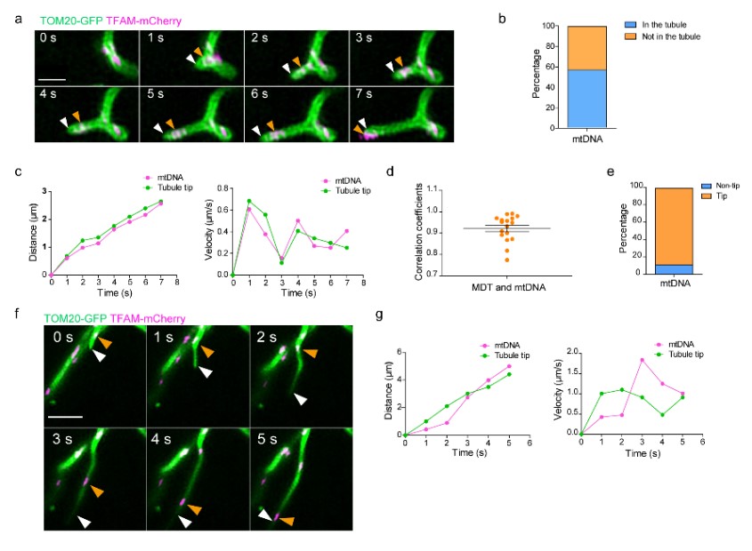 研究人员借助GI-SIM超分辨成像技术,对细胞内的线粒体以及线粒体拟核的动态过程进行多色、高速、长时程的超分辨成像。线粒体动态管化是指马达蛋白KIF5B在线粒体本体上沿着微管拖出一条动态细管【7】。研究人员发现线粒体拟核可以随着线粒体动态管化过程进入拖出的细管并最终定位在管子尖端。研究者发现线粒体拟核随着动态管化运动的过程并非仅仅是一种搭车行为,线粒体拟核会以超过管子延伸的速度在细管中做主动运动(图1)。
