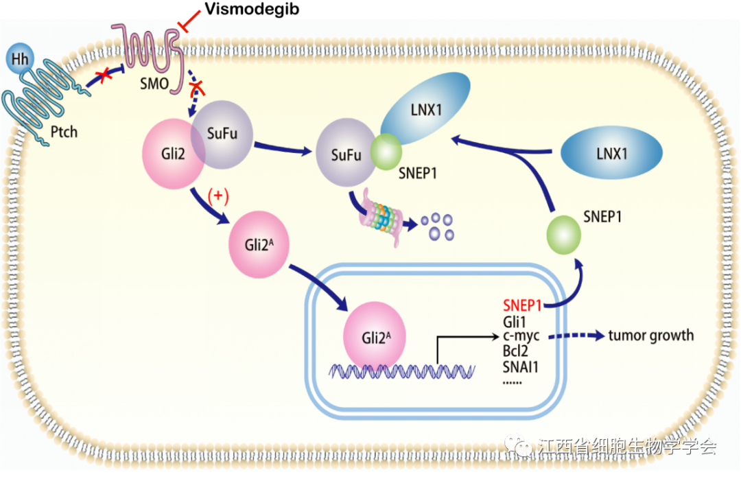该团队采用高通量测序筛选分析,发现SNEP1是Hh的新靶基因,该基因在结直肠癌组织中高表达,且表达水平与患者的生存呈负相关。研究发现,SNEP1能促进结直肠癌细胞的增殖,并通过裸鼠皮下移植瘤模型及转基因小鼠模型证实该基因能促进结直肠癌的生长;SNEP1通过促进负调控因子SuFu降解激活Hh信号通路,进而促进结直肠癌细胞增殖;分子机制研究揭示,SNEP1作为一个支架蛋白,促进E3泛素连接酶LNX1与SuFu相互作用,进而诱导SuFu蛋白降解,激活Hh信号通路。而这种下游的反馈激活机制,可以不依赖上游受体Smo,故而推测SNEP1可能导致结直肠癌对Smo临床靶向药物Vismodegib(GDC-0449)的耐药,并且通过细胞实验证实了这一推测。