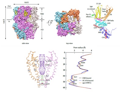 在跨膜区有数个脂类/去垢剂结合位点(图4)。在结合CMZ的TRPC5电子密度图中,在跨膜螺旋S5和S6之间观察到了类似DAG的密度。HPLC-MS实验也证明蛋白样品中含有DAG。在结合HC-070的TRPC5电子密度图中,DAG头部的密度被HC-070替代了,而两条脂肪链尾巴的密度却还保留着。