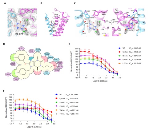 HC-070结合在跨膜区的孔道结构域,结合位点由一个亚基的跨膜螺旋S5、孔道螺旋和相邻亚基的跨膜螺旋S6组成(图3)。HC-070与TRPC5上的众多氨基酸有相互作用:F576的侧链与HC-070的甲基黄嘌呤形成π-π堆积作用;R557,Q573,W577与HC-070的羟丙基形成极性相互作用;F599, A602和T603同时也参与稳定羟丙基;F569和L572与HC-070的氯苯环形成疏水相互作用(图3)。功能实验结果显示,HC-070对以下这些突变体:R557A, F569A, L572A, Q573A, F599A,F599N,T603A的抑制效力减弱,其中,对Q573A的抑制效力减弱得最明显(图3),说明Q573A与HC-070羟丙基形成的氢键对于HC-070结合并抑制TRPC5具有至关重要的作用。