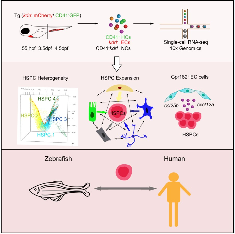 利用单细胞转录组测序技术,研究人员选取3个造血干细胞发育的重要时间点(55hpf,3.5hpf,4.5hpf)对斑马鱼尾部造血组织28777个细胞(包含HSPCs,内皮细胞及非内皮/HSPCs细胞)进行深入分析。首先,研究人员鉴定出斑马鱼尾部造血组织不同分化倾向性的HSPCs和各谱系血细胞。其次,通过对CHT微环境成分的深入解析,研究人员发现CHT存在动态发育过程,即微环境细胞协同HSPCs发育。研究人员还鉴定了一群特殊的促扩增内皮细胞和其特异的微环境因子Gpr182。斑马鱼体内功能实验证明,Gpr182可以促进HSPCs在尾部造血组织的扩增,并且Gpr182的功能在小鼠中是保守的。最后,通过将斑马鱼尾部造血组织和人胎肝的单细胞数据进行比对分析,研究人员发现二者在进化上具有保守的细胞类群基因表达,而其差异性则体现在细胞类型组成和HSPC的转录组特征,即:斑马鱼的扩增性造血组织的HSPC更能适应温度变化,人胎肝中的HSPC具有更强的免疫特征。上述结果暗示了造血干细胞对环境的适性进化。