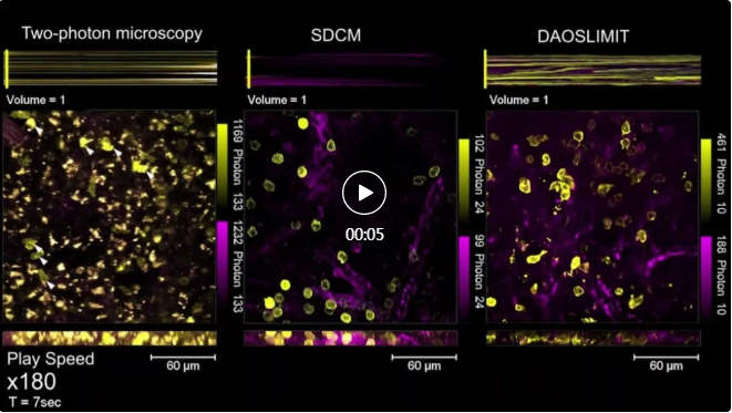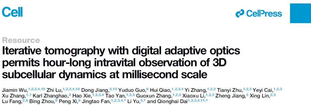 2021年5月25日,清华大学脑与认知科学研究院、自动化系戴琼海院士课题组,生命科学学院俞立课题组合作在Cell上发表了题为 Iterative tomography with digital adaptive optics permits hour-long intravital observation of 3D subcellular dynamics at millisecond scale 的研究论文。该团队独辟蹊径地提出了数字自适应光学框架,发明了扫描光场成像技术,历经三年的攻关,研制了扫描光场显微镜,合称为 (Digital Adaptive Optics Scanning Lightfield Mutual Iterative Tomography, DAOSLIMIT)。DAOSLIMIT在225×225×16 μm3的成像视野范围内,以横向220nm和轴向400nm光学衍射极限分辨率,将以毫秒级活体三维连续观测时长从数分钟提高到小时级,活体成像时空分辨率提升两个数量级,光毒性降低三个数量级,为揭示哺乳动物活体多细胞、多细胞器间的相互作用提供了全新路径。