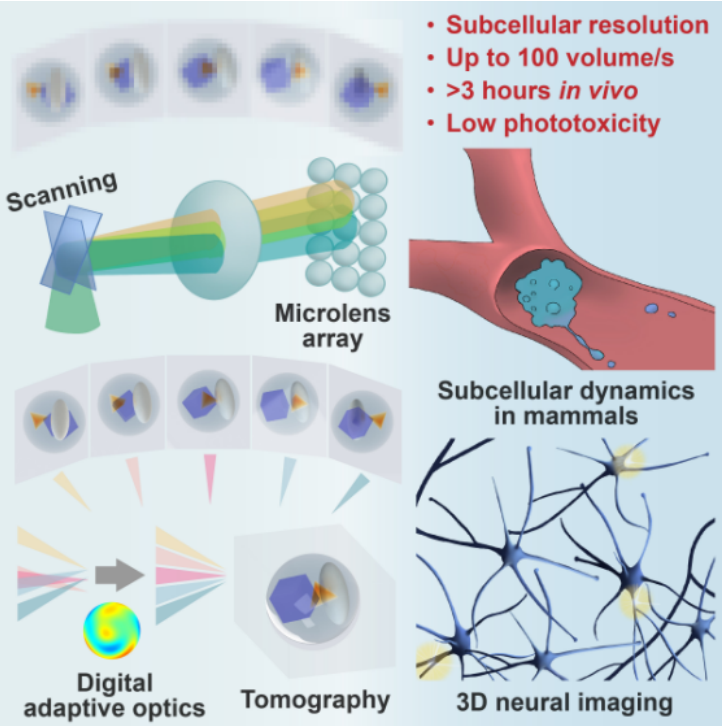 对活体高速高分辨率长时观测能力矢志不渝的追求,贯穿了显微技术几个世纪的发展史,是生命科学和医学研究的破冰船,是发现新现象、揭示新机制的先行官。然而受到三维组织分布、光学像差、光毒性等诸多胶着问题的限制,在哺乳动物活体环境下进行高速亚细胞分辨率长时程观测始终悬而未决,极大地制约了脑科学、肿瘤学与免疫学的深入研究。