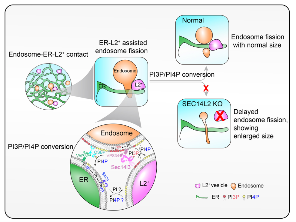 图2. 高尔基体分泌的SEC14L2小泡与内质网协同调控内吞体分裂的模式图。SEC14L2小泡通过与内质网和内吞体之间形成膜相互作用,促进内吞体上PtdIns4P向PtdIns3P转换,从而促进内吞体分裂。