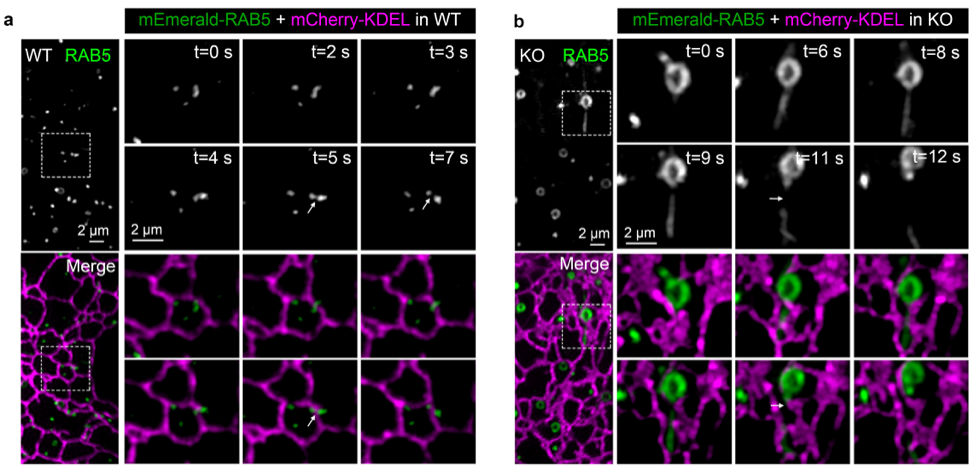 图1. 与野生型的COS7细胞(a)相比,SEC14L2敲除的细胞(b)表现为内吞体分裂延迟及体积增大。