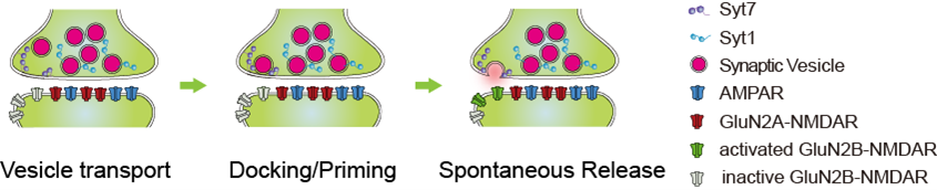 图一. Syt7介导的谷氨酸自发释放特异性激活GluN2B-NMDARs
