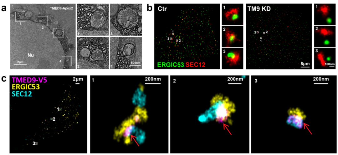 作者通过体外重建自噬体的脂化系统、膜泡分离和质谱鉴定,发现ERGIC蛋白TMED9在调控自噬体产生过程中发挥重要的作用。TMED9缺失细胞内自噬体产生水平下降。电镜显示APEX2标记的TMED9-ERGIC膜和双层膜自噬体紧密关联(图2a)。先前研究发现饥饿条件下ERES产生形变并和ERGIC 发生联系,该过程调节自噬。作者发现TMED9缺失的细胞中ERGIC(ERGIC53)和ERES(SEC12)之间的距离变大,提示TMED9调控ERGIC和ERES之间的相互关系(图2b)。这个结论也被3D多色STORM(与许可实验室合作)成像支持。结果显示TMED9在饥饿条件下定位于ERGIC和ERES的交界处(图2c)。