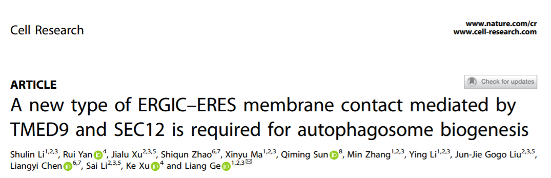 2021年9月24日,清华大学葛亮研究组在Cell Research期刊在线发表了题为 A new type of ERGIC-ERES membrane contact mediated by TMED9 and SEC12 is required for autophagosome biogenesis 的研究论文,报道了一条由TMED9和SEC12蛋白相互作用介导的ERGIC-ERES新型内膜互作调节自噬体膜形成的分子通路。