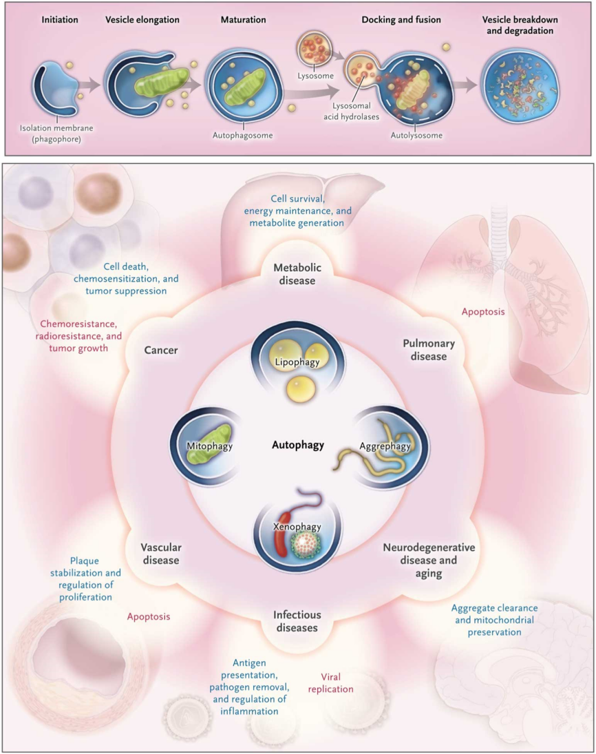 细胞自噬是一种由溶酶体介导的细胞内降解途径,在进化上非常保守,其生物学功能涉及诸多方面,与生物的生长发育、衰老、以及人类重大疾病等密切相关(图1)【1-3】。自噬调控基因鉴定的前驱大隅良典教授于2016年获得了诺贝尔生理医学奖。细胞自噬的一个核心步骤是双层膜自噬体的形成,该过程需要内膜系统提供膜来源,并通过内膜形变的方式产生自噬体膜前体。内膜系统如何转变成自噬体是自噬领域多年来的谜题之一。