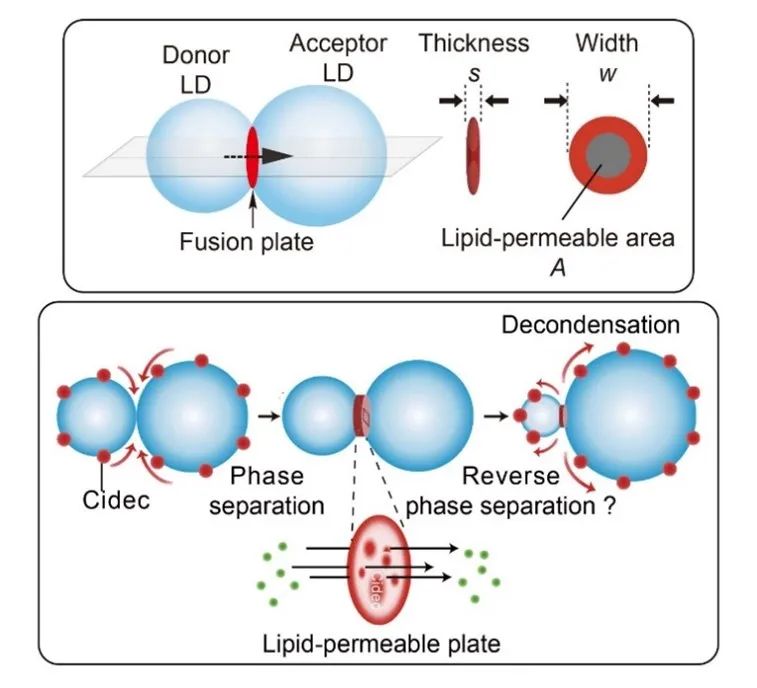 图2. 脂滴融合圆盘的示意图及其形状特点;模型展示Cidec相分离与反向相分离介导脂质可渗透圆盘的组装与拆解