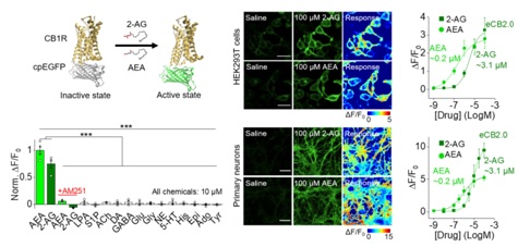 内源大麻素(endocannabinoids, eCBs),包括花生四烯酸甘油酯(2-Arachidonoylgylcerol,简称2-AG)和花生四烯酸乙醇胺(N-arachidonoylethanolamide,简称AEA),是由神经元合成和释放的一类脂类神经调质分子。经典神经递质从突触前末梢释放,激活突触后膜受体;而eCB“反其道而行之”——在突触后神经元释放,逆行性地作用在特定类型神经元突触前膜大麻素受体CB1R(Cannabinoid receptor type 1)上,发挥突触前抑制作用。近二十年来的研究发现,eCB参与大脑多个脑区,包括皮层、海马、纹状体、杏仁核、下丘脑和黑质等,的突触可塑性调节,对维持神经系统的正常功能至关重要,与奖赏行为、能量代谢、学习记忆、睡眠觉醒、情绪等多种生理过程密切相关。内源大麻素系统的调控异常也与神经退行性疾病、癫痫、成瘾、抑郁症和精神分裂症等诸多神经疾病和精神类疾病密切相关。然而,目前缺乏高灵敏度、高时空分辨率的实验手段直接检测在体eCB的动态变化,极大地限制了人们对其在生理和病理状态下重要功能和分子调控机理的研究。