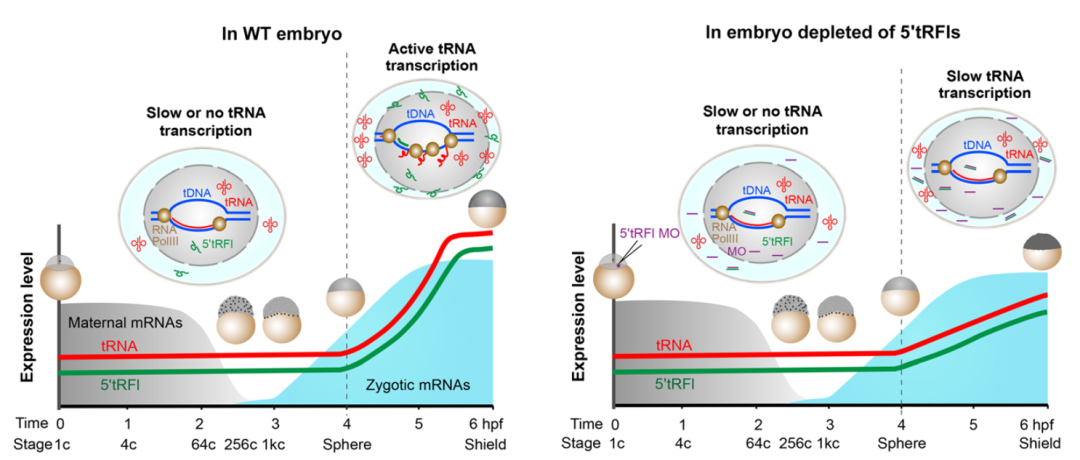 2021年11月19日,清华大学生命学院的孟安明教授课题组在杂志Science Advances在线发表了题为 5’Half of specific tRNAs feeds back to promote corresponding tRNA gene transcription in vertebrate embryos的研究论文。该研究论文首次报道了来源于tRNAGlu/CTC和tRNAGly/GCC的5‘端衍生小RNA(5‘tRNA-Fragment long, 5’tRFl)在斑马鱼胚胎发育早期调控tRNA转录的机制。敲低胚胎中5’tRFlGlu/CTC和5’tRFlGlyGCC,将导致相应的tRNA水平降低,翻译效率下降,最终胚胎发育停滞。本研究发现,这两种5‘tRFl通过与tRNA竞争结合tDNA模板链形成R-loop结构,从而促进tRNA的转录,维持了早期胚胎发育的正常进行。