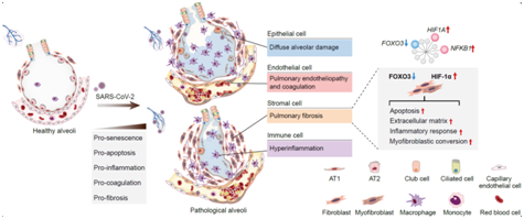 附图:示意图显示该研究揭示的上皮细胞衰老、脱落、凋亡升高、过度炎症反应、凝血和纤维化加剧是COVID-19肺的主要病理表型特征,也是全身系统性免疫损伤的“发源地”和“主战场”。