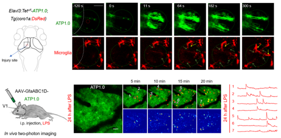 图1:ATP1.0报告斑马鱼受到局部损伤时及小鼠发生免疫反应时大脑中的胞外ATP信号