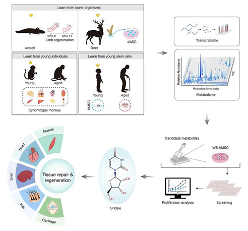 该研究首次绘制了跨物种、跨年龄以及跨组织细胞的内源性代谢物的全景图谱,系统解析了强再生能力所伴随的分子代谢通路。更为重要的是,该研究发现尿苷是一种能延缓人类干细胞衰老、促进哺乳动物多组织再生修复的关键代谢物。这些发现为深入认识机体损伤或病理修复的机制奠定了理论基础,并为提升老年群体的健康、预防和治疗衰老相关疾病提供新的策略。