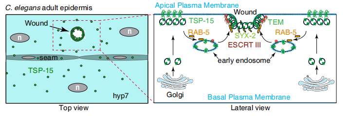 成年线虫表皮为139个细胞融合而成的一个巨大的多核单细胞,在过去的研究中课题组通过快速活体成像和遗传学方法,发现线粒体能够快速感应损伤发生片段化促进修复(Fu et al., Nature Communications 2020),同时鉴定到细胞膜融合蛋白EFF-1在细胞膜损伤修复中的重要功能(Meng et al., Dev Cell 2020)。在该项工作中,研究者将目光聚焦与广泛分布于细胞膜上的四次跨膜蛋白(Tetraspanins, TSPs),发现TSP-15不仅在成年线虫表皮中表达,而且能够对针刺、激光、单线氧化学损伤、遗传突变所导致的损伤等多种细胞膜损伤方式发生响应,并在伤口处发生明显聚集。研究表明,无论是组成 ESCRT III 的关键亚基VPS-32.1(CHAM4B同源基因)还是 VPS-4(AAA+ ATPase)的RNAi敲降都会显著抑制TSP-15::GFP在伤口处的聚集,并且导致更多的 TSP- 15滞留在由 RAB-5 标记的异常形态的早期内体上。最后,研究团队发现 TSP-15 通过与膜修复蛋白 SYX-2 发生互作,并通过进一步招募SYX-2 在在伤口处的聚集来促进细胞膜的修复。
