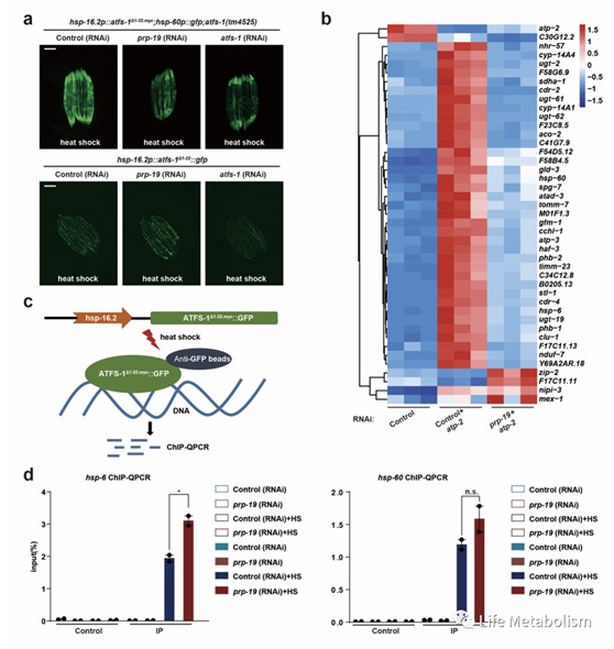 (a:在热激条件下线粒体定位序列缺失的ATFS-1Δ1-32表达定位于细胞核,激活下游基因hsp-60启动子启动的GFP的表达。prp-19 RNAi抑制细胞核定位的ATFS-1Δ1-32诱导的GFP的表达。b:ATFS-1结合启动子区域且在线粒体应激条件下受到prp-19调控的基因表达热图;c,d:ChIP-QPCR检测不同条件下ATFS-1分别结合hsp-6和hsp-60启动子序列的信号强弱)
