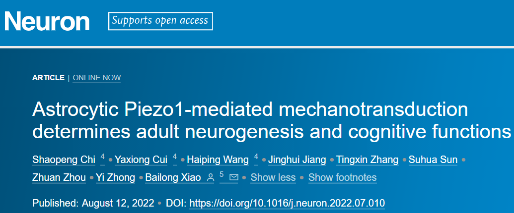 2022年8月12日,清华大学肖百龙团队在Neuron 在线发表题为“Astrocytic Piezo1-mediated mechanotransduction determines adult neurogenesis and cognitive functions”的研究论文,该研究表明机械门控 Piezo1 通道在星形胶质细胞的探索过程中表达,并利用其机械敏感性来介导机械诱发的 Ca2+ 反应和 ATP 释放,从而在星形胶质细胞中建立 Piezo1 介导的机械化学转导。