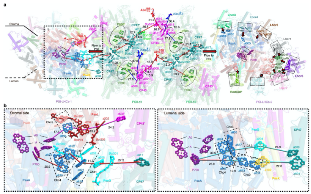 光合生物为应对自然界不断变化的光照条件进化出了一种应答机制。当PSII获取的激发能量过高时,为避免PSII损伤,捕光天线会向PSI进行能量传递,从而进行能量的再分配。目前认为,蓝藻和红藻的PBS可能通过间接地PBS→PSII→PSI模式和直接地PBS→PSI模式向PSI进行能量传递。然而由于缺少结构信息,对于PBS与PSI之间的能量传递机制一直存在争议。现在解析出来的PBS-PSII-PSI-LHC复合体的原位结构显示,红藻PBS仅与PSII直接相互作用,因此捕获的光能会先传递给PSII,进而通过PSII向PSI进行传递,这与能量溢出模型保持一致(图2)。此外,研究人员还发现PSII和PSI中存在特殊排列的叶绿素(chl)簇,他们的紧密排列促使共轭环上的π电子发生激发态耦合效应,使能级降低,以保证能量的高效传递(图2)。综上,该研究成果证明红藻通过间接地PBS→PSII→PSI模式向PSI进行能量传递,从而进行PSII和PSI的能量再分配。同时该成果也为人工模拟光合作用研究提供了新的理论依据。