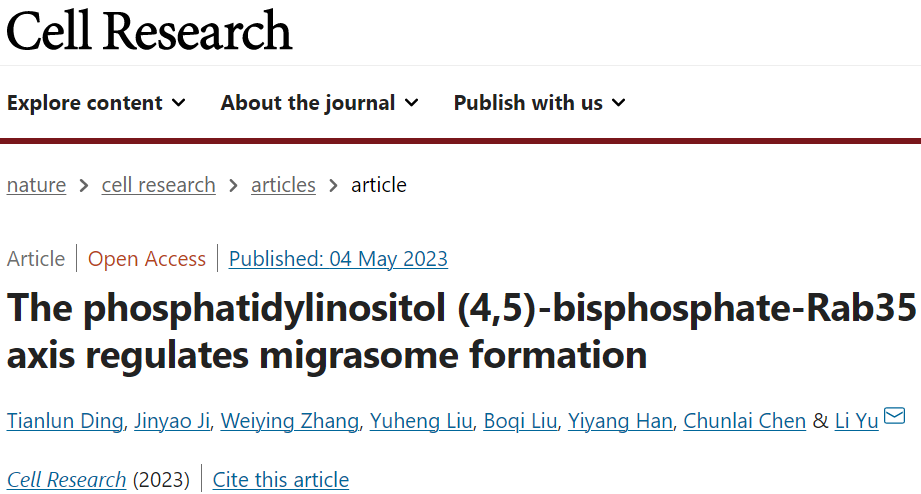 2023年5月4日,清华大学俞立团队在Cell Research 在线发表了题为“The phosphatidylinositol (4,5)-bisphosphate-Rab35 axis regulates migrasome formation”的研究论文,该研究发现在迁移体形成之前,PIP5K1A,一种将PI4P转化为PI(4,5)P2的PI4P激酶,被募集到迁移体形成位点。PIP5K1A的募集导致在迁移体形成位点产生PI(4,5)P2。