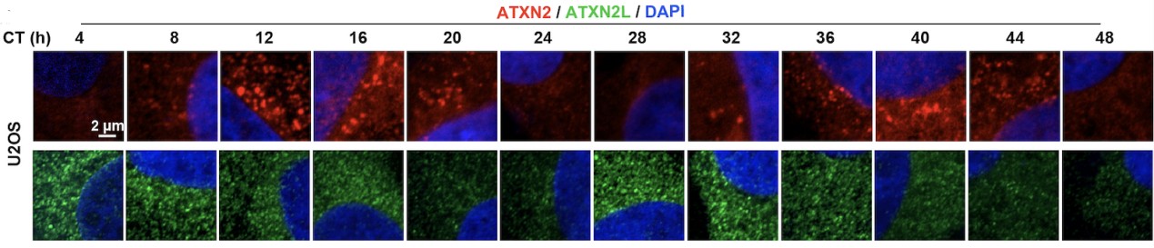 通过对细胞和组织的染色观察,研究人员发现ATXN2/2L在哺乳动物脑内中枢生物钟所在的视交叉上核(Suprachiasmatic Nucleus,SCN)以及体外培养的细胞中都会形成蛋白凝聚体(图2)。这些凝聚体位于核周且其大小及数量随昼夜节律振荡。研究人员通过Cryo-mill-IP的方法分离并分析了不同时间点ATXN2凝聚体中的蛋白组分,结果显示,ATXN2凝聚体依时序招募并激活一系列的生化反应,包括在CT 12时招募RNA加工相关蛋白,在CT 16时大量募集翻译起始因子和核糖体蛋白。