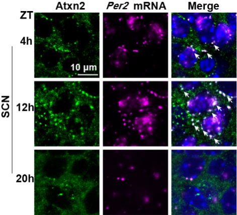 图3 ATXN2凝聚体在SCN中与PER2 mRNA共定位