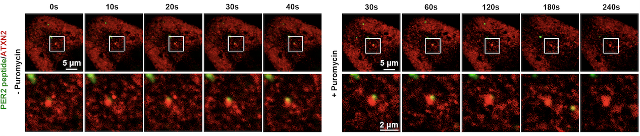 图4 利用SunTag技术观察PER2蛋白在ATXN2凝聚体中合成