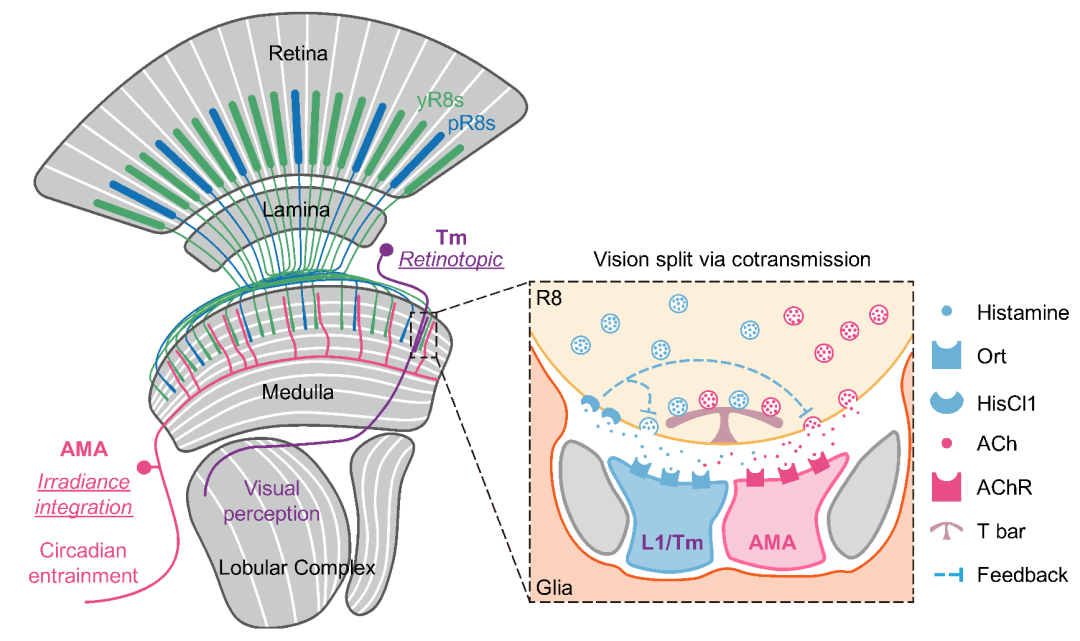神经细胞经特殊的连接点——突触联接起来所组成的神经环路是神经系统(脑)的基本功能单元,其细胞间信号的传递通过释放某种化学物质(神经递质)来实现,不同的神经细胞释放不同的递质,从而行使不同的功能。视觉最重要的功能是分辨图像(图像视觉),而另一些功能(非图像视觉)虽与图像生成并无直接关联,但起着重要的辅助作用(如对昼夜节律的调节等)。尽管研究者们很早就认识到,视觉系统的这两种功能分别通过两类感光细胞来实现:一类解析局部反差,另一种解析整体光亮度1,2;同时近年的研究表明,产生局部反差的感光细胞也能传递整体光亮度3,4,但其神经机制尚不清楚。2023年10月25日,北京大学生命科学学院、麦戈文脑研究所、定量生物学中心、北大-清华生命科学联合中心罗冬根团队在Nature发表题为“A single photoreceptor splits perception and entrainment by cotransmission”的研究论文,报道了在果蝇中局部反差和整体亮度信号的分离可通过同一感光细胞同时释放两种递质来实现。