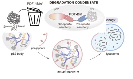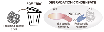 PDF-Bin取名自P62 Degradation Factory based on a BI-specific Nanobody(基于双特异性纳米抗体的p62降解工厂),由特异性结合p62的纳米抗体(Pn)、特异性结合靶标蛋白的纳米抗体和一段柔性连接子所构成。为了获得p62的纳米抗体,研究人员通过噬菌体展示技术联合显微成像共定位分析进行筛选,获得了3种特异性结合p62的纳米抗体(A1E、D9A和E12C)。将这3种Pn分别融合EGFP荧光标签的纳米抗体Gn构建而成的PDF-Bin(A1E-Gn、D9A-Gn和E12C-Gn)均对EGFP-TDP43蛋白具有较好的降解效果。