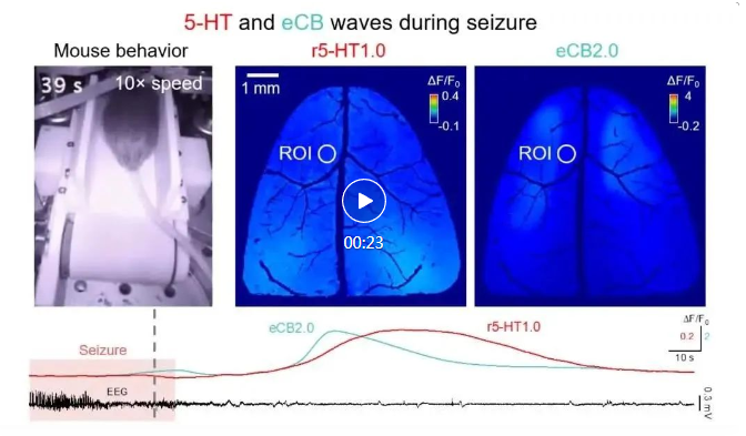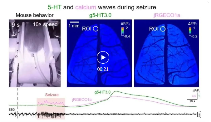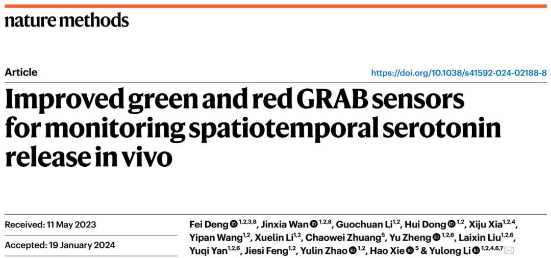 2024年3月5日,北京大学李毓龙实验室在Nature Methods杂志在线发表了题为“Improved green and red GRAB sensors for monitoring spatiotemporal serotonin release in vivo”的研究论文,基于GRAB探针策略(GPCR-Activation Based Sensor)成功开发出了全新的红色5-HT荧光探针和新一代绿色5-HT荧光探针,并通过光纤记录和大视场成像等方式实现了在活体小鼠多脑区、多行为范式下对5-HT和其它信号的同时检测。实现了从“看得见”到“看得清、看得多、看得广”的突破。