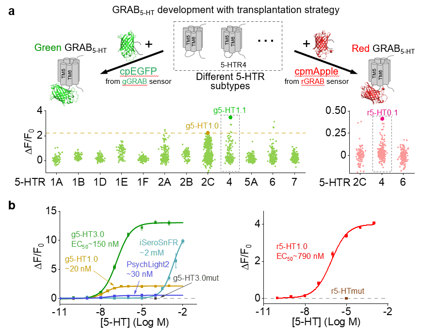 李毓龙团队将已有的神经递质探针中的荧光报告模块移植到不同5-HT受体亚型中,通过不断迭代优化开发了新一代的5-HT绿色探针g5-HT3.0和全新的红色探针r5-HT1.0(图1)。
